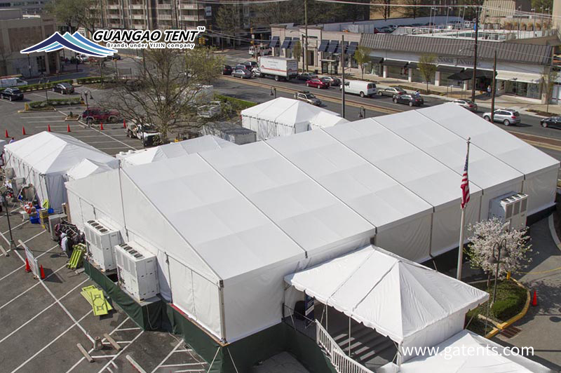 La portée maximale de la tente combinée Guangao est de 65 mètres et la bache sélectionnée est de 850 grammes / mètre carré.La structure interne de la tente présente de solides performances de sécurité, ce qui convient aux mariages, célébrations, fêtes, expositions, banquets, etc. Il présente des avantages fonctionnels et une apparence unique.
