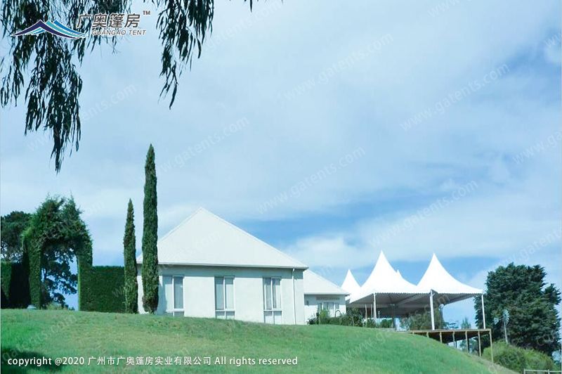 此澳大利亞宴會(huì)篷房面積是2000平方米,完全以組合型來(lái)達(dá)到客戶的需求。在無(wú)場(chǎng)地限制的情況下,按照實(shí)際要求,在森林境地下安裝有不帶圍布的尖頂篷房,還有大型的人字形篷房,有著多種不同形狀的篷房組合成一套個(gè)性化的宴會(huì)篷房。